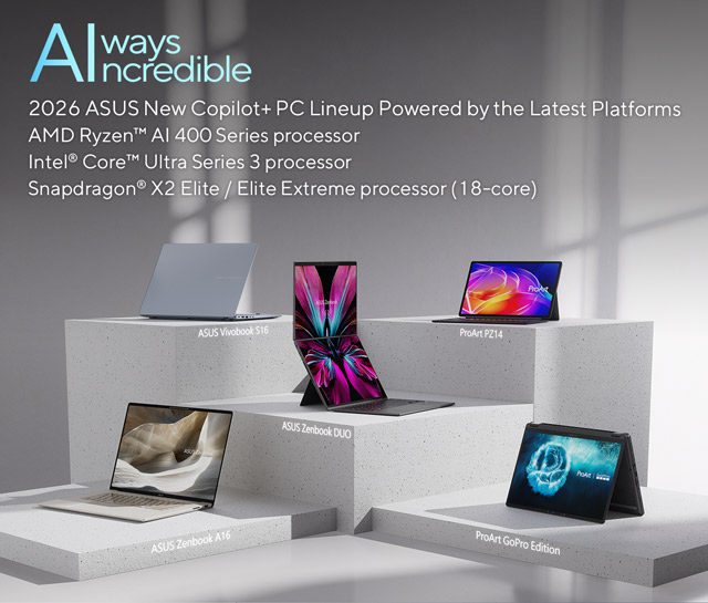 ASUS har lanserat sin nya 2026 Copilot+‑serie av bärbara datorer med modeller som Zenbook Duo‑varianter och en ultralätt 16‑tummare, utrustade med högupplösta OLED‑skärmar, kraftfulla processorer och dedikerad NPU‑prestanda för AI‑funktioner.