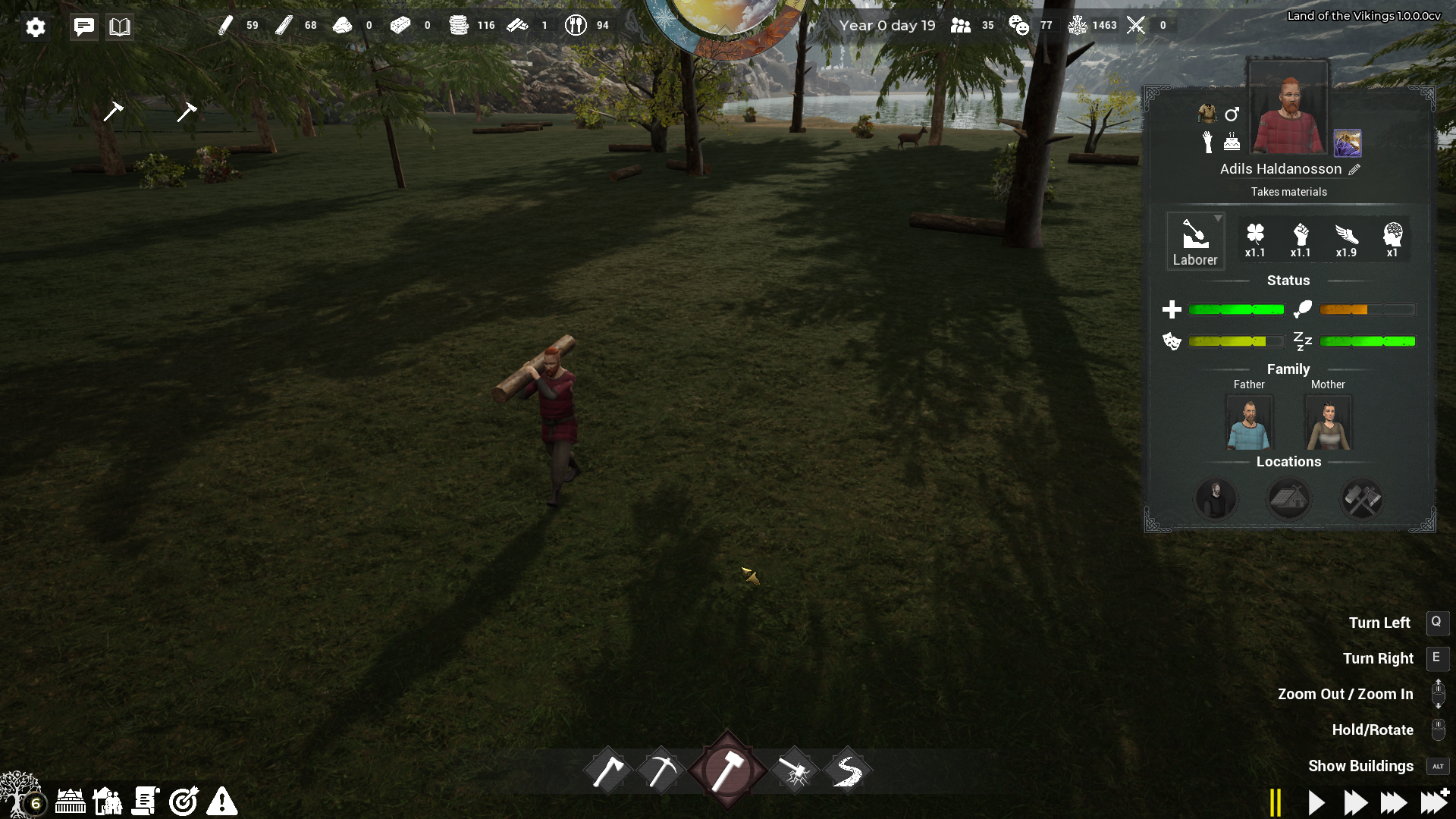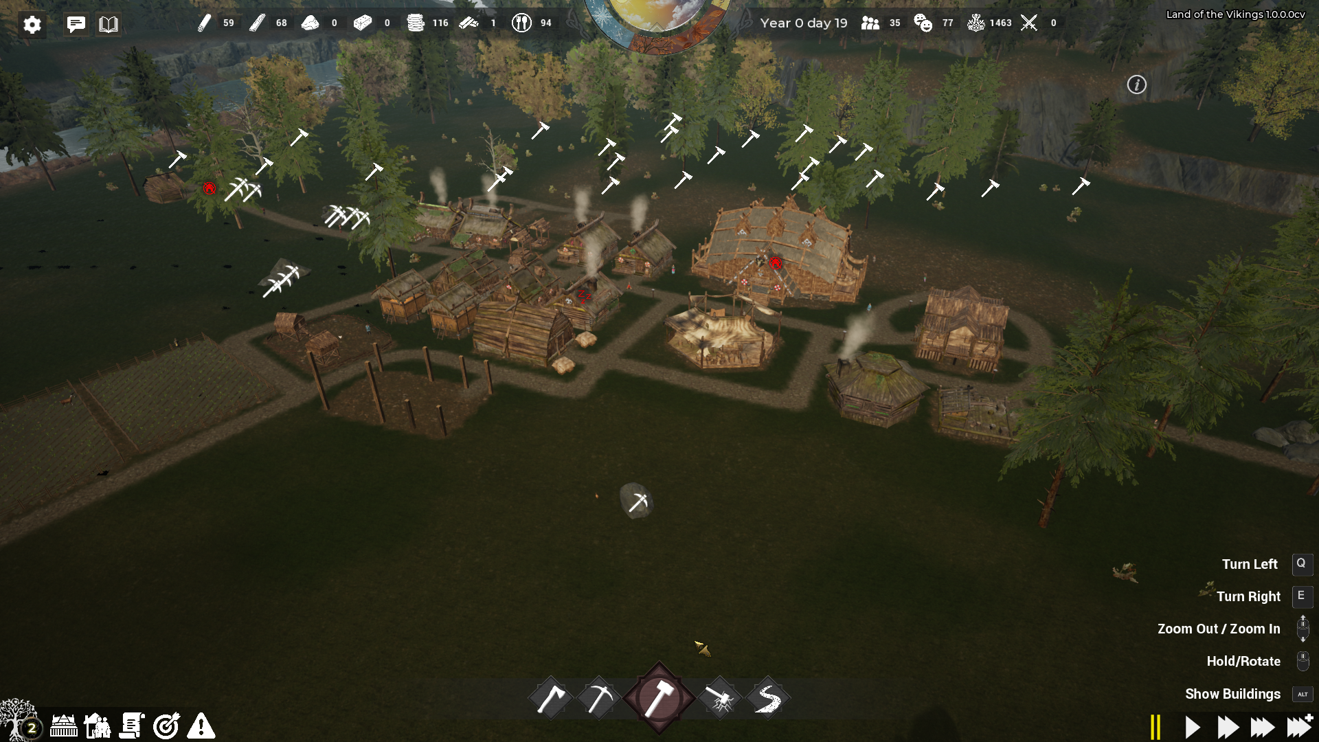 Det tidiga spelet börjar långsamt, men mitt i spelet har ett intressant flöde där du som spelare har precis tillräckligt med handlingskraft för att hålla dig sysselsatt genom att manuellt fylla byggnader, beordra dina nybyggare att odla, hugga ved och samla sten. Det känns likt många andra kolonisimmar och ändå tillräckligt annorlunda på grund av Land of Vikings extrafunktioner som bybornas statistik.