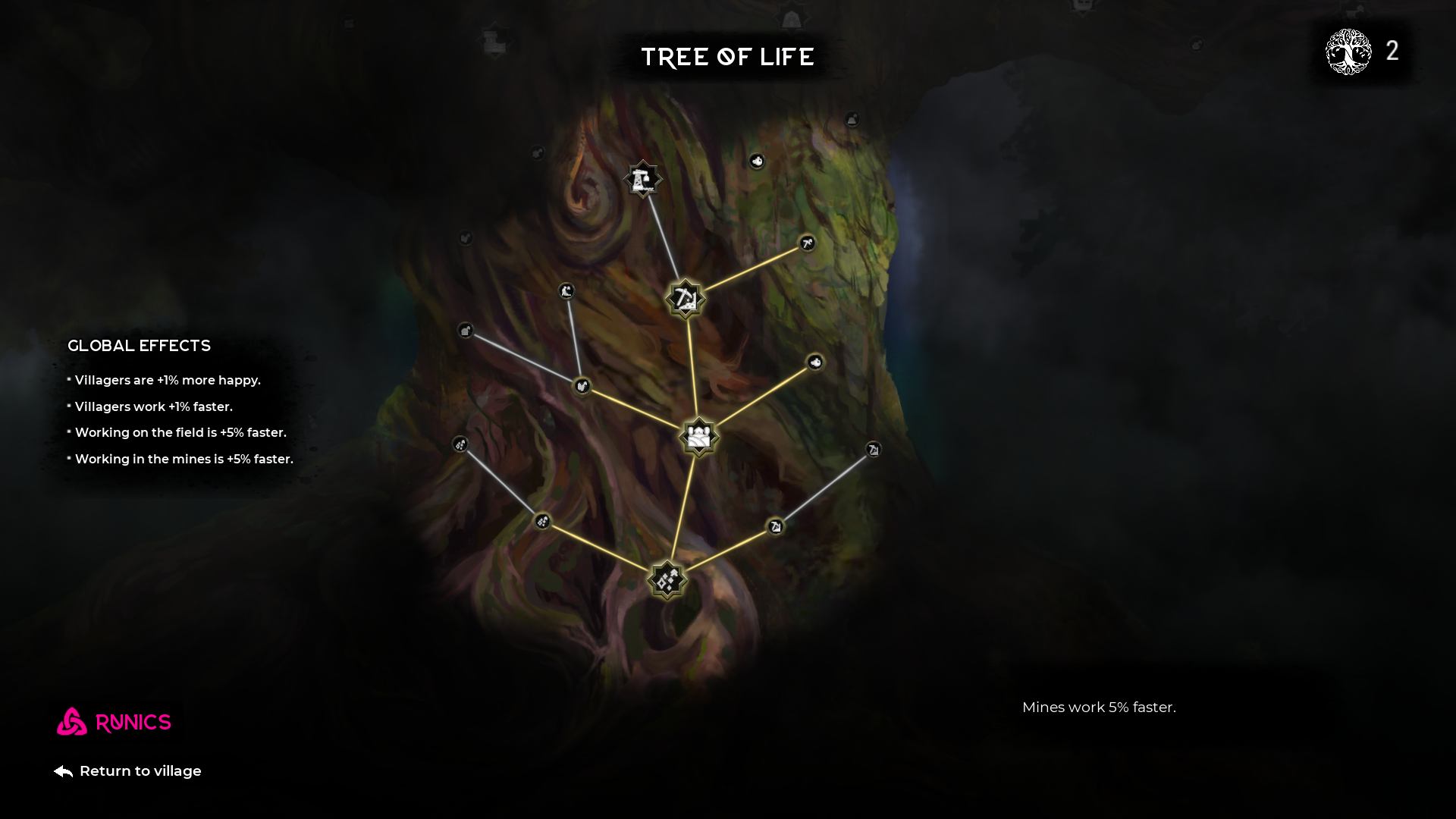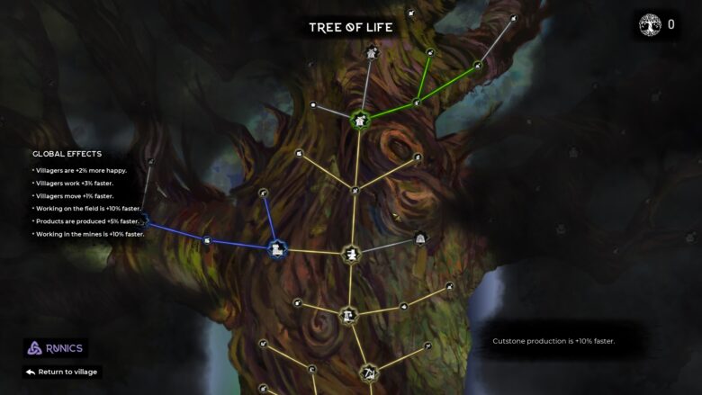 The Tree of Life, spelets version av teknikutvecklingsträdet, är fyllt med både intressanta val som nya byggnader och teknik som du kommer att sträva efter att låsa upp, såväl som vadderade noder som bybornas ökade hastighet på vägarna.