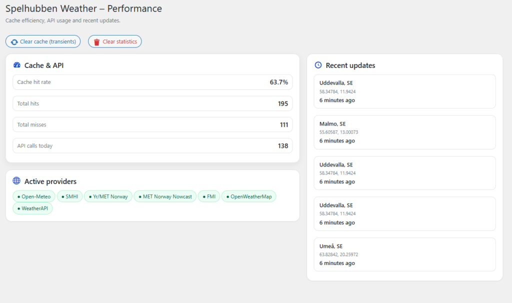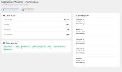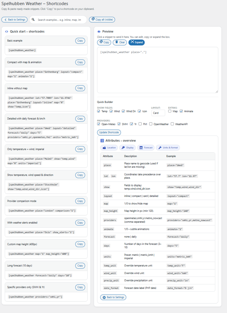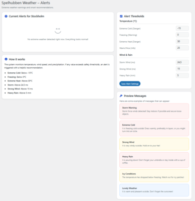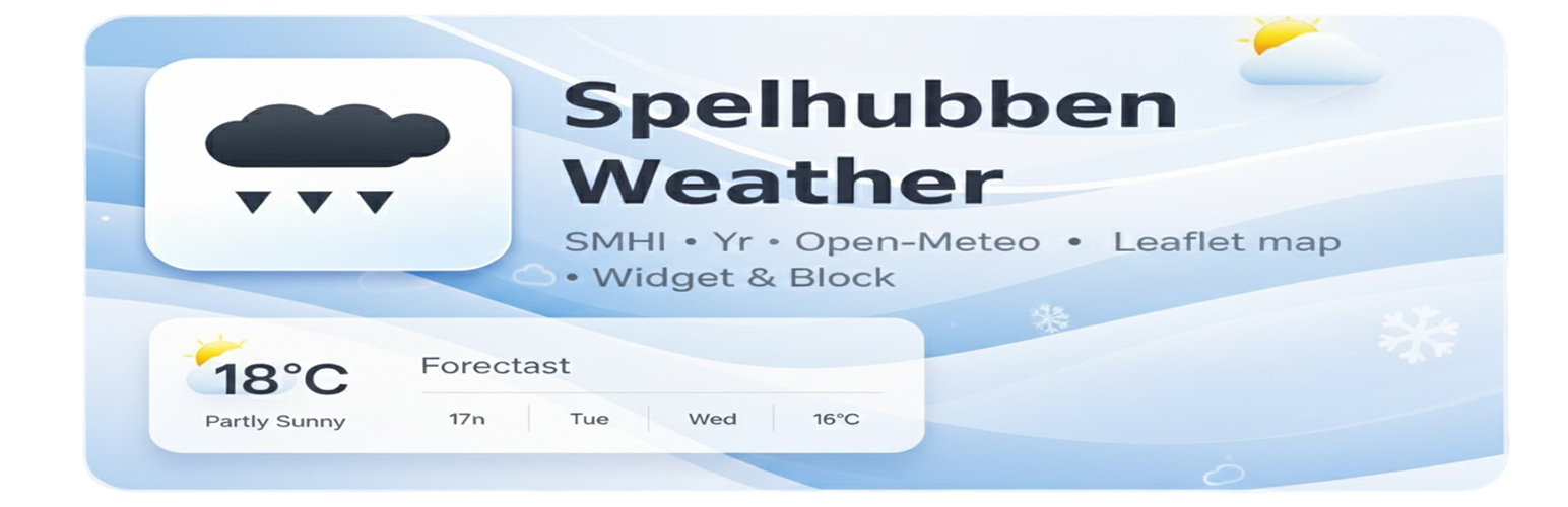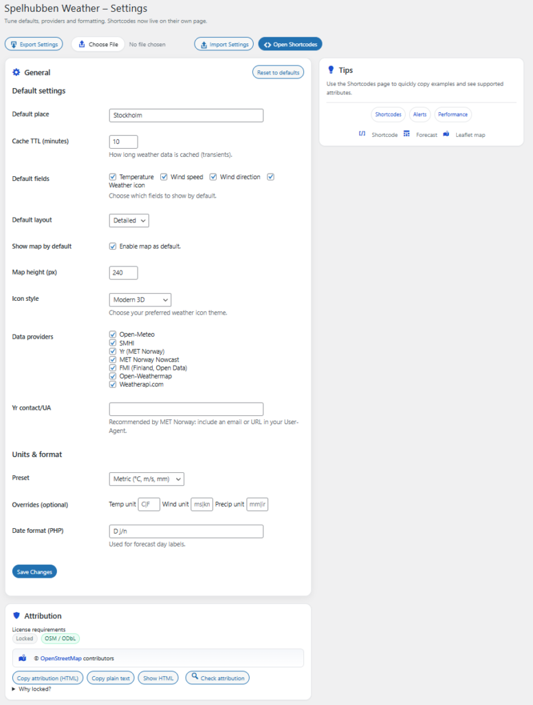 1. Go to **Settings → Spelhubben Weather** and select standards (place, layout, map, etc.).