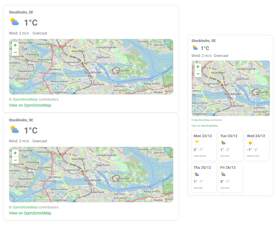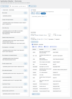3. Customize with attributes like `place`, `layout`, `map`, `forecast`, `days`, `providers`, `units`.